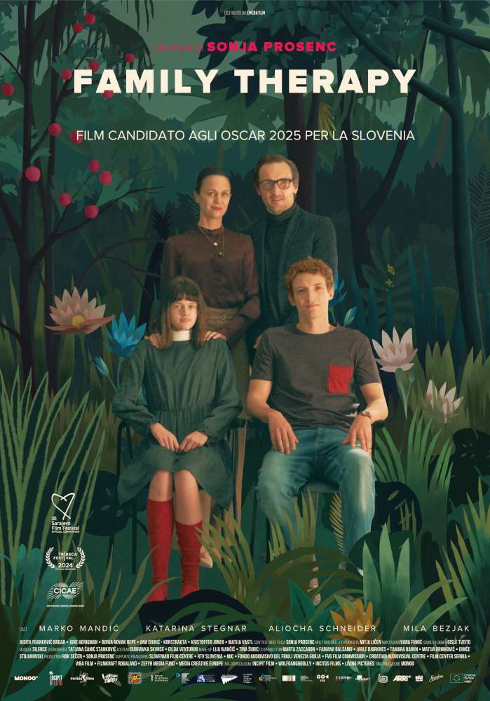 Dopo aver preso fuoco, un’auto brucia sul ciglio della strada. Una giovane famiglia ha un disperato bisogno di aiuto. Nelle vicinanze transita un’auto impeccabile. Al suo interno, una famiglia apparentemente perfetta, che non prova neanche a rallentare. Chi sono queste persone che scelgono di non fermarsi? “Family Therapy” ruota attorno a una famiglia slovena “nouveau riche” che vive in una casa di vetro, ostentando fredda superiorità. L’ambientazione funge da sfondo satirico per una rivisitazione umoristica della premessa del Teorema di Pasolini: un giovane estraneo arriva in casa della famiglia, sconvolgendo il delicato equilibrio delle dinamiche familiari e rivelando un mondo caotico e le loro relazioni disfunzionali, apparentemente ben nascoste. L’iperprotettività soffocante della madre Olivia nei confronti della figlia Agata, l’evasione del padre Aleksander alimentata dai sogni di compiere viaggi nello spazio con la famiglia e il segreto nascosto sotto la parrucca di Agata. Il film non si limita a mettere in discussione le azioni di coloro che non si fermano ad aiutare, ma indaga anche le ragioni che stanno dietro alle loro scelte. Si stanno isolando dal mondo esterno per preservare il fragile equilibrio della famiglia, evitando le proprie vulnerabilità per paura, o la loro apparente indifferenza verso il mondo circostante è un sintomo appreso che riguarda problemi sociali più ampi?